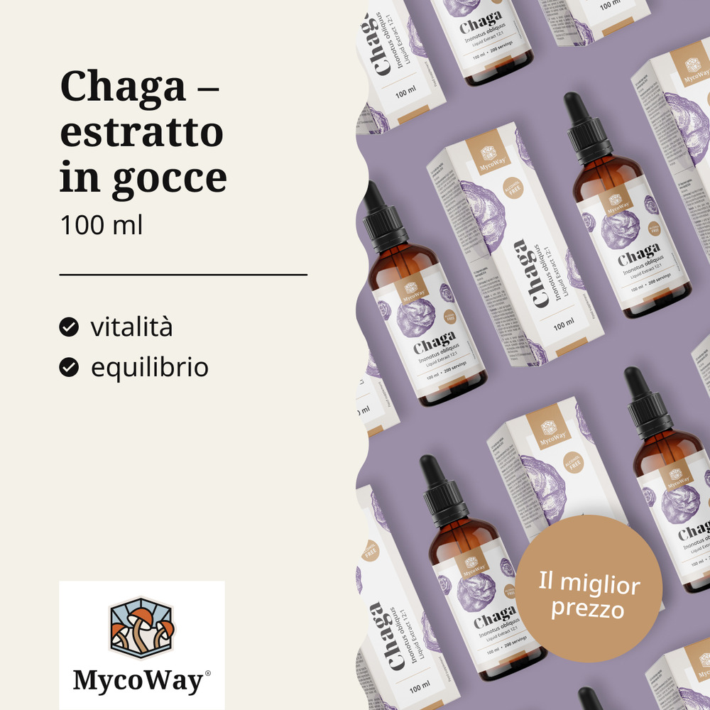 Questo è reso ancora più facile dall'estratto liquido di chaga in gocce, il quale, confezionato in una bottiglietta scura con contagocce, unisce tradizione e modernità.